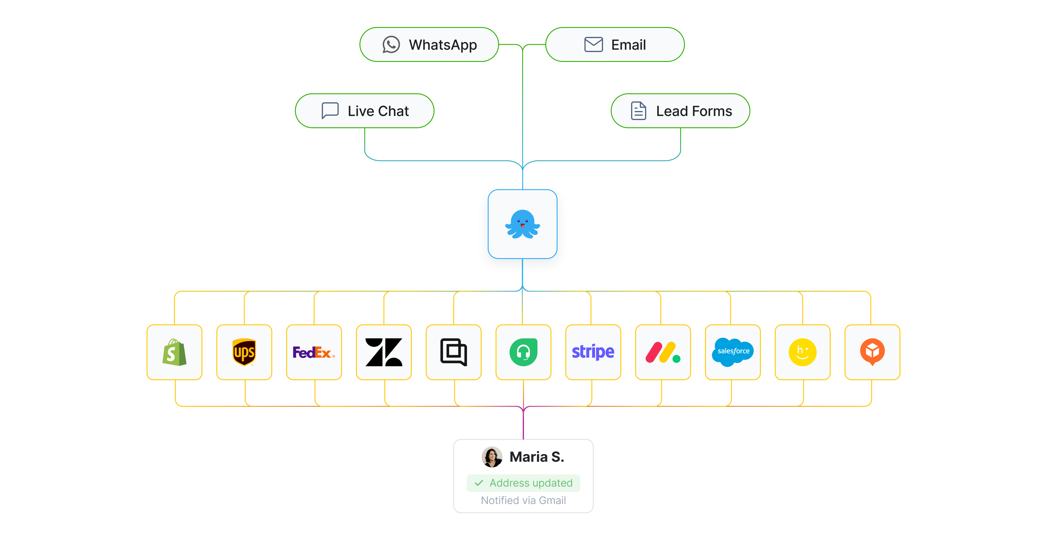Whether you’re using modern tools like a WhatsApp business chatbot, Stripe, Zendesk, Gmail, or Monday.com, or more niche and legacy systems specific to your industry, our team will customize the AI agents to plug into your stack.